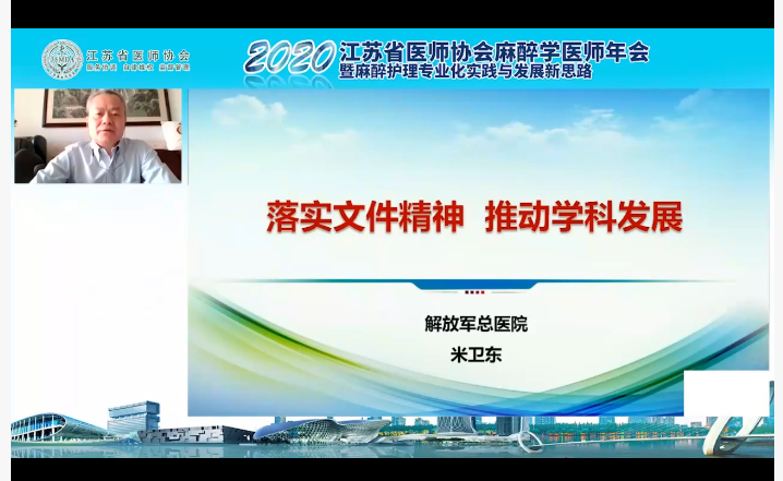 中国医师协会麻醉学医师分会会长于布为教授线上致辞,他对在抗疫一线的麻醉学同仁表达敬意,并指出在所有科室中麻醉科应当是重症治疗的一线主力军,希望各级麻醉医生加强对重症治疗的重视。