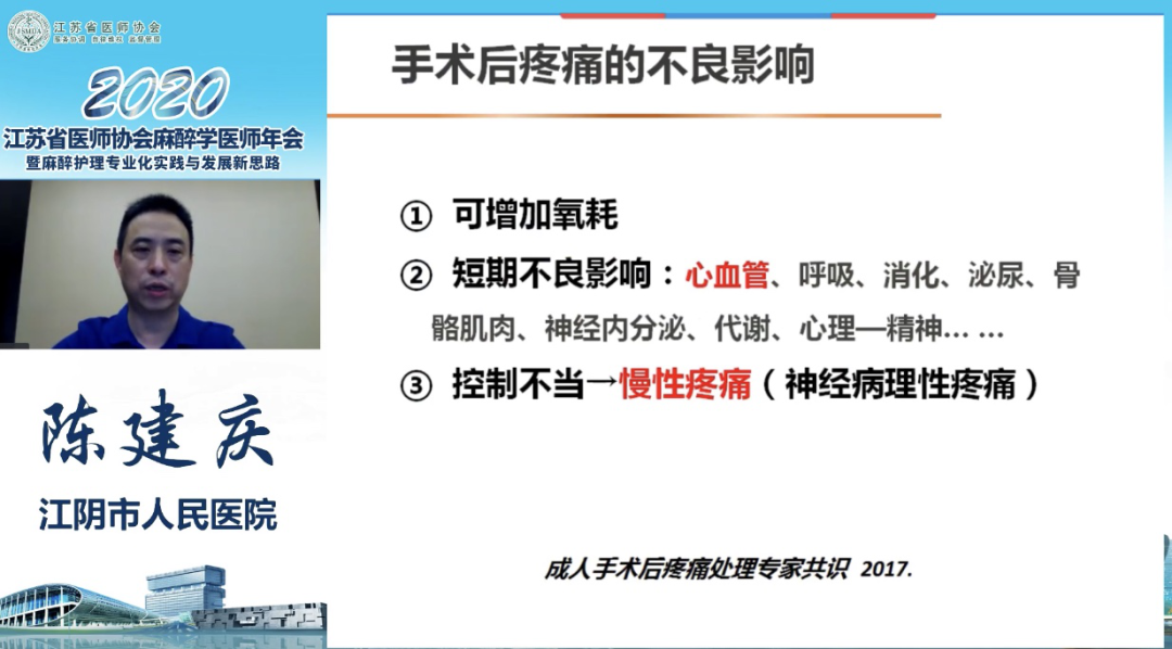 江阴市人民医院麻醉科主任、江苏省医师协会麻醉医师分会委员陈建庆教授为我们带来了《围术期急性疼痛相关研究》的最新研究成果,详细介绍了疼痛学说的发展历史,从机制上分析了围术期急性疼痛研究的进展,内容丰富多彩,对我们后续的疼痛研究工作具有极好的学习借鉴作用。