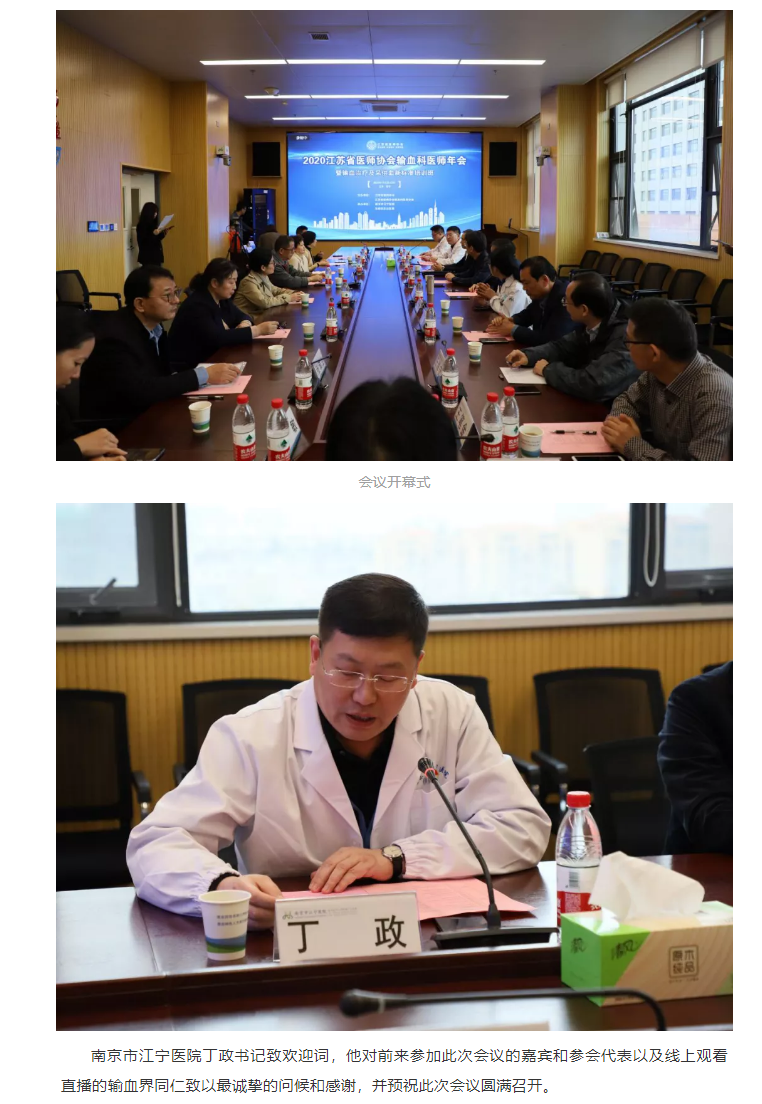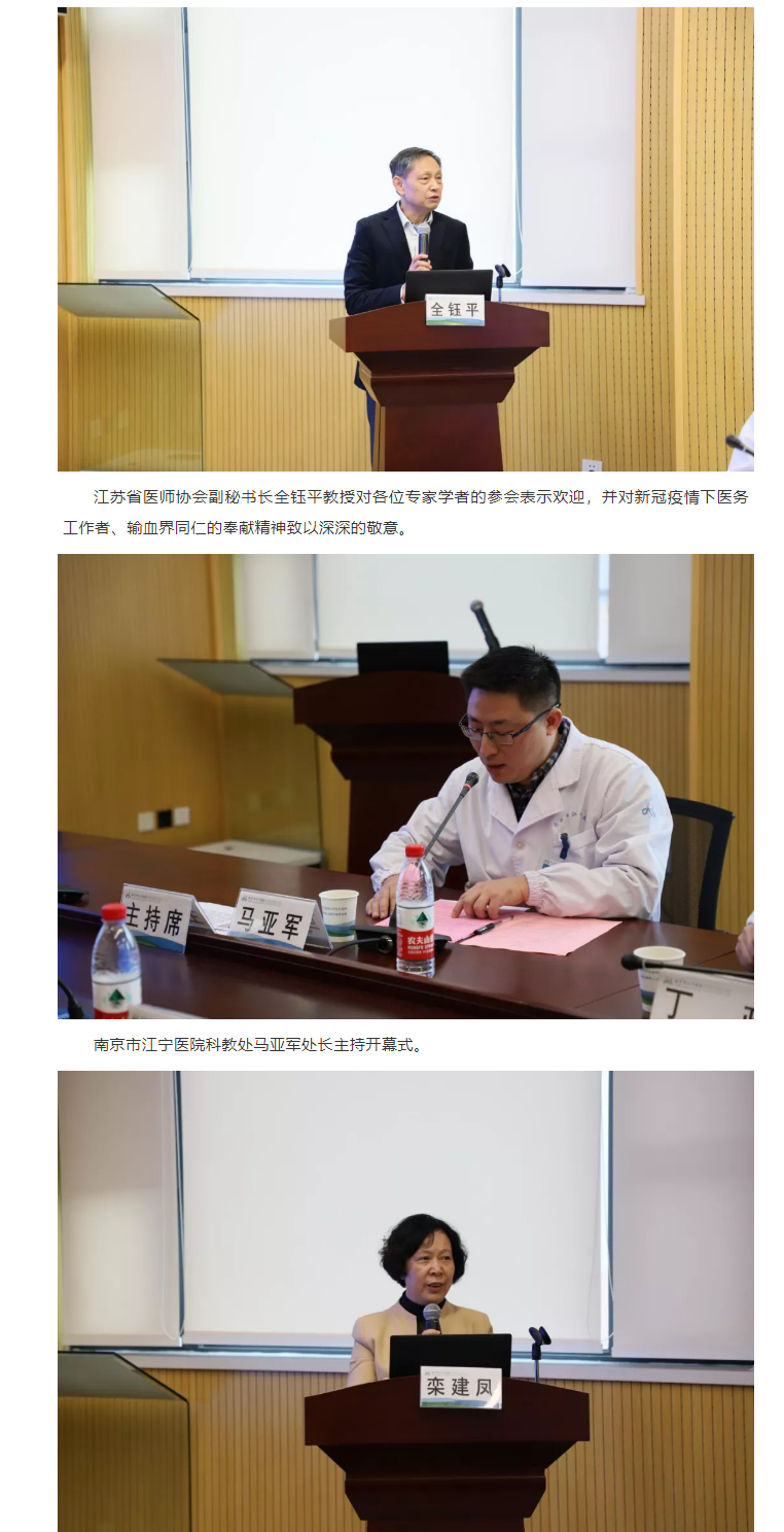 2020年11月20日至22日,2020 江苏省医师协会输血科医师年会暨输血治疗及采供血新标准培训班在南京举行。本次会议由江苏省医师协会主办,江苏省医师协会输血科医师分会协办,南京市江宁医院、东部战区总医院承办。南京市江宁医院丁政书记、江苏省医师协会全钰平副秘书长、南京市江宁医院马亚军主任、输血科医师分会会长及委员出席会议。开幕式由马亚军主任主持。