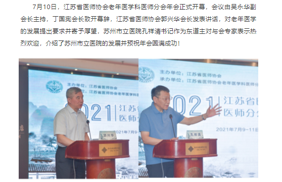 2021年7月9日-7月11日,江苏省医师协会老年医学科医师分会年会在有着2500多年历史的苏州护城河畔拉开帷幕。本次会议由江苏省医师协会主办、江苏省医师协会老年医学科分会及苏州市立医院承办。