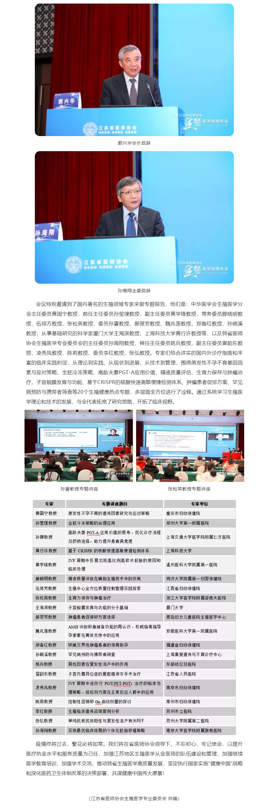 开幕式由江苏省医师协会生殖医学专业委员会候任主任委员姚兵教授主持。江苏省医师协会生殖医学专业委员会孙海翔主任委员、中华医学会生殖医学分会黄国宁主任委员、江苏省医师协会郭兴华会长出席开幕式并致辞,勉励生殖医学专业委员会充分发挥组织和技术优势,积极搭建多形式、多层次的学术交流平台,大力推广生育健康和备孕助孕知识普及,坚持宣教和基层医师培训,为江苏地区人民生殖健康与社会和谐服务。