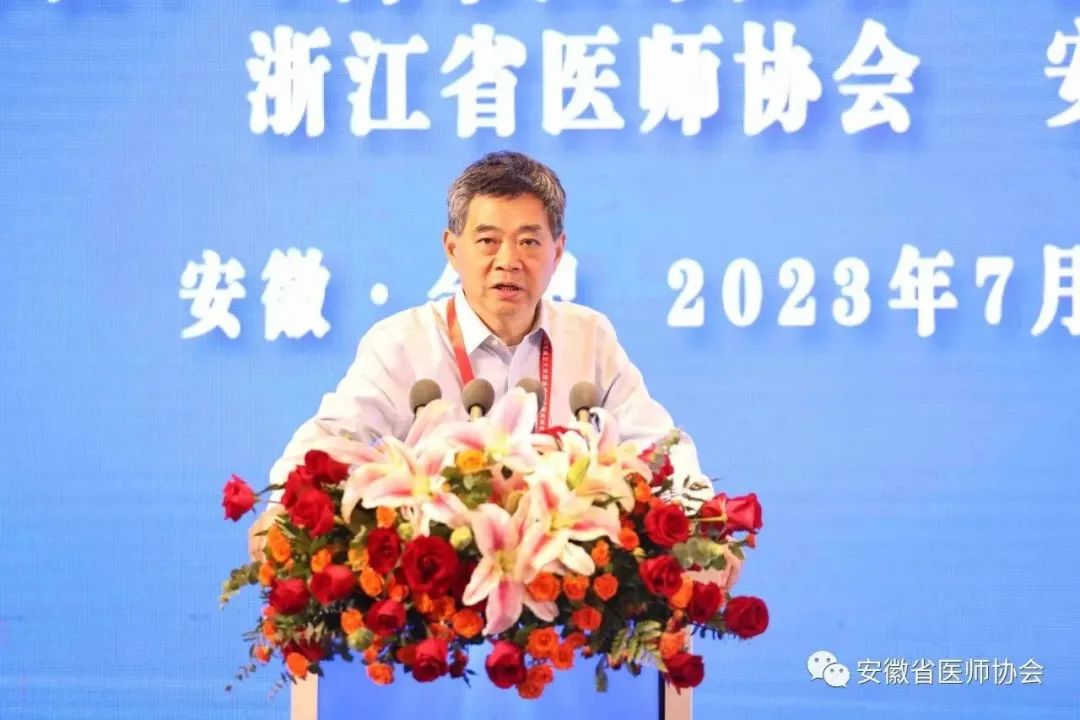长三角医师联盟轮值主席、安徽省医师协会会长梁朝朝教授致辞。梁朝朝表示作为东道主,安徽省医师协会真诚地欢迎来自上海市、江苏省、浙江省医师协会的会长、秘书长们及各位医学同道。梁朝朝表示在加速推进长三角一体化高质量发展的关键时期,沪苏浙皖共筑“健康长三角”,着力推进医疗卫生服务一体化。这是长三角区域一体化建设的重要内容,也是深化医药卫生体制改革、完善医疗卫生保健体系、推进健康中国建设的战略举措。梁朝朝回顾了三年多来安徽抗击疫情中医务工作者所做的努力以及安徽省医师协会发展情况,并用“好山好水好人”概括了安徽的地理历史特点。他对联盟提出三点希望:一是以联盟成员单位二级机构为着力点,建立覆盖各学科的专科联盟;二是以联盟成员单位的名医资源带动医疗资源互通互联;三是充分利用联盟成员单位的学术影响力,定期举办高水平的高峰论坛、学术交流和专题培训,形成长三角的优质品牌。