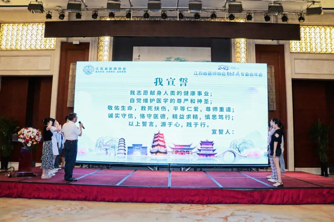 今年是第六个中国医师节,主题是:勇担健康使命,铸就时代新功。为庆祝第六个中国医师节,在年会开幕前,特举行医师宣誓仪式。成兴波主委带领在场的全体人员,宣读誓词:我宣誓:我志愿献身人类的健康事业;自觉维护医学的尊严和神圣;敬佑生命,救死扶伤,平等仁爱 ,尊师重道;诚实守信,恪守医德,精益求精,慎思笃行;以上誓言,源于心,践于行。