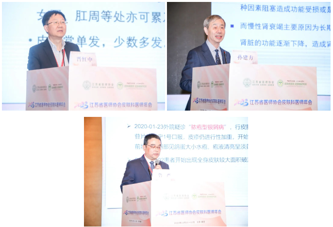 11日上午,在孙建方教授及南通大学附属医院曹双林教授的主持下,北京协和医院皮肤科主任晋红中教授将临床表现和病理特点相结合进行了主题为“角质形成细胞来源肿瘤的诊断要点及陷阱”的讲座。随后,孙建方教授以肾功能衰竭为切入点,深入浅出地介绍了肾衰导致的包括肾型脱发、钙化防御、kyrle病、对半甲等一系列皮肤病,分享了丰富的临床诊治经验。接下来,在中国医学科学院皮肤病医院杨勇教授主持下,南京医科大学第一附属医院鲁严教授通过TEN样大疱性类天疱疮、大疱性红斑狼疮、水疱大疱性皮肌炎等5个病例,介绍了少见的大疱性重症皮肤病及诊治关键。