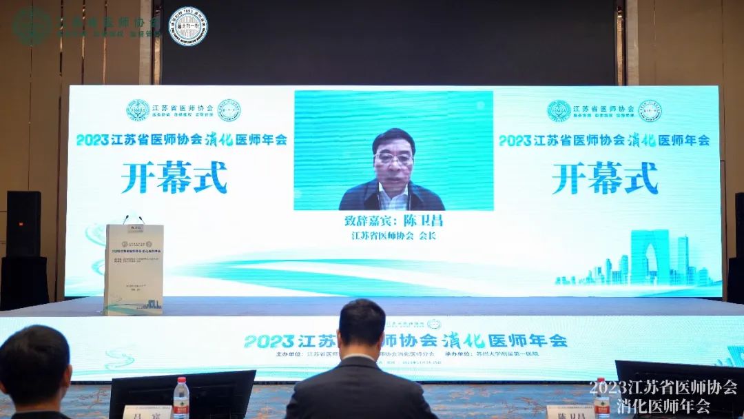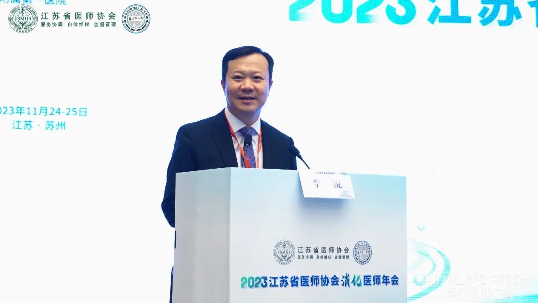 2023年11月24至25日,由江苏省医师协会、江苏省医师协会消化医师分会主办,苏州大学附属第一医院承办的“2023江苏省医师协会消化医师年会”在苏州顺利举办。本次会议开幕式由苏州大学附属第一医院消化科主任李锐主持,江苏省医师协会消化医师分会候任主任委员汪芳裕、苏州市医学会秘书长谭秋生以及江苏省医师协会会长、江苏省医师协会消化医师分会会长陈卫昌分别致辞。