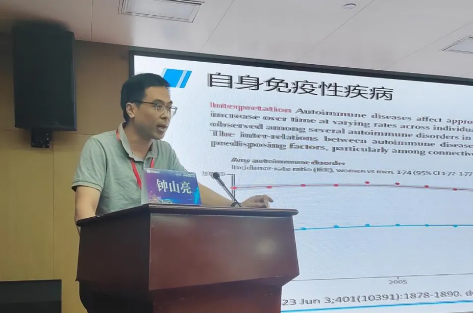 江苏大学附属医院副院长、学科带头人、江苏省检验医学重点实验室副主任王胜军教授带来了《自身免疫性疾病免疫干预新策略》讲座,讲述了自身免疫性疾病的免疫干预新策略。他首先概述了自身免疫性疾病的机制,指出其与基因和环境等多种因素有关。王胜军教授介绍了当前国际上的研究进展,特别是自身抗原和T细胞、B细胞在疾病中的作用,并强调了调节性T细胞和Th17细胞在治疗中的潜力。他还探讨了靶向B细胞和干扰I型干扰素等新兴治疗策略,最后展望了未来研究的方向,强调了多学科交叉合作的重要性。报告由淮安市第二人民医院医学检验部金跃教授主持。