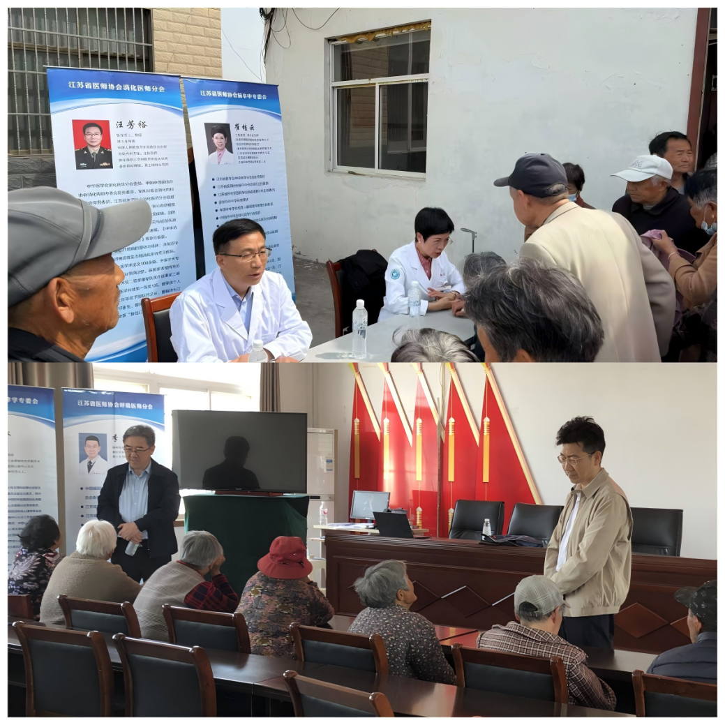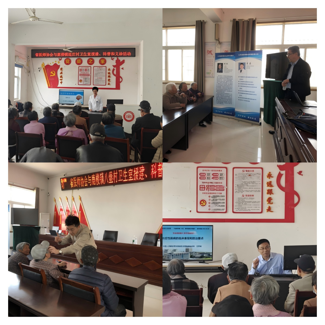 上午9:40,健康讲座及义诊活动同时在鹿楼镇姬庄村、八堡村举行,由本会二级机构4个学科受邀专家参加,省医师协会消化医师分会现任会长、东部战区总医院消化内科汪芳裕主任,省医师协会脑卒中专委会候任主任委员、徐州医科大学附属医院神经内科崔桂云主任,省医师协会心律学专委会副主任委员、徐州市中心医院心脏中心韩冰主任,省医师协会呼吸医师分会委员、徐州医科大学附属医院季磊主任,